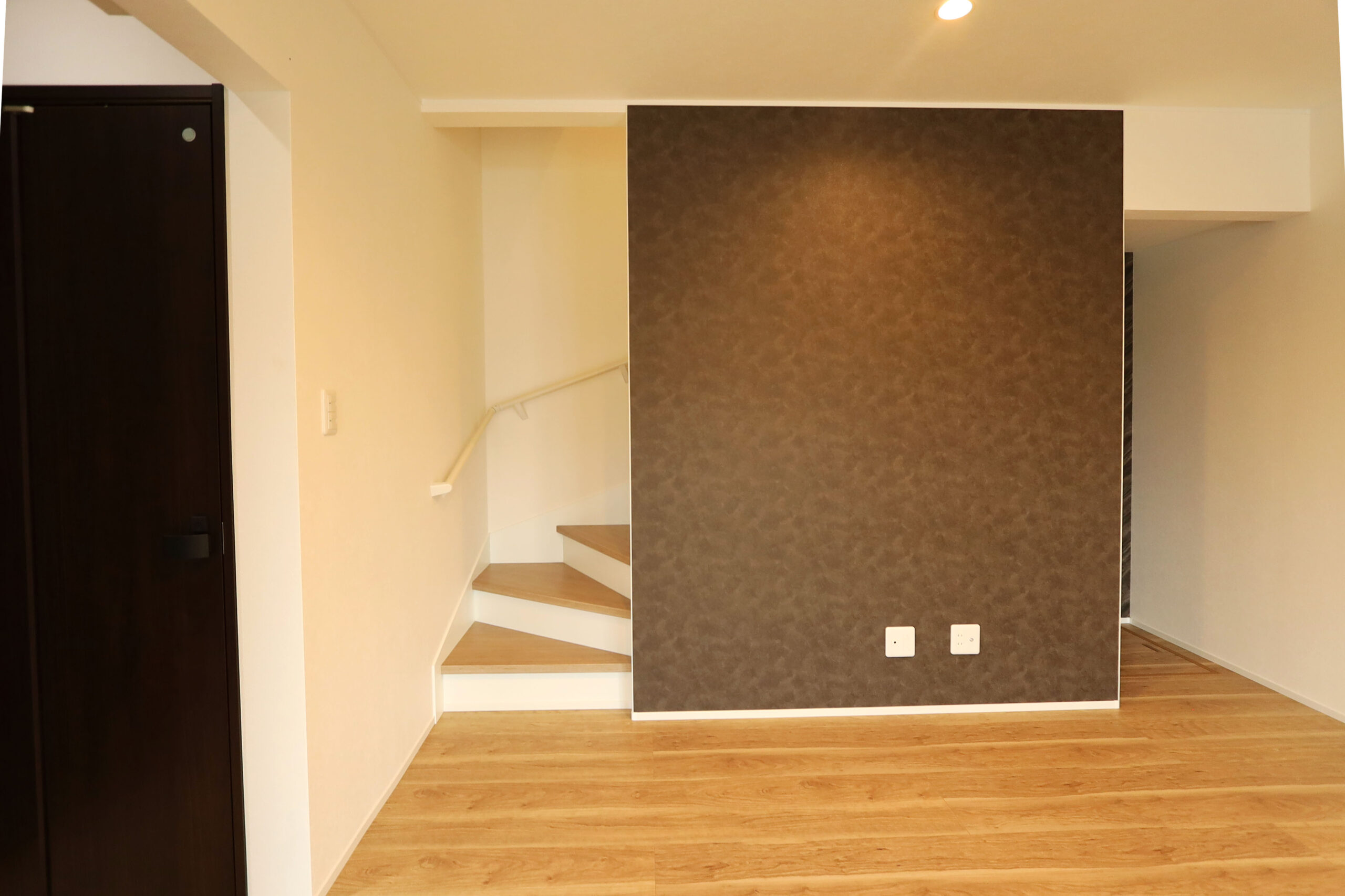 リビング:リビングからつながる階段 高気密住宅だからリビング階段によりリビングのエアコン一台で家全体が暖かくなります。完成してしまうと見えなくなってしまう構造体や断熱材をしっかり施工することで快適な省エネ住宅を実現しています。