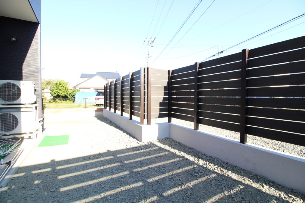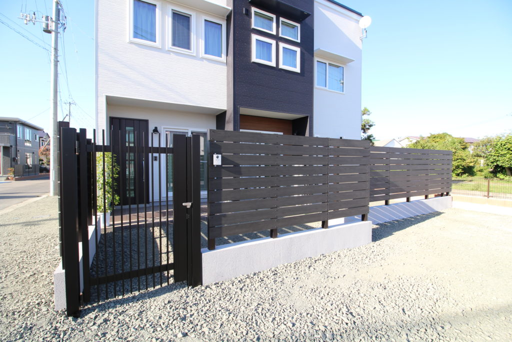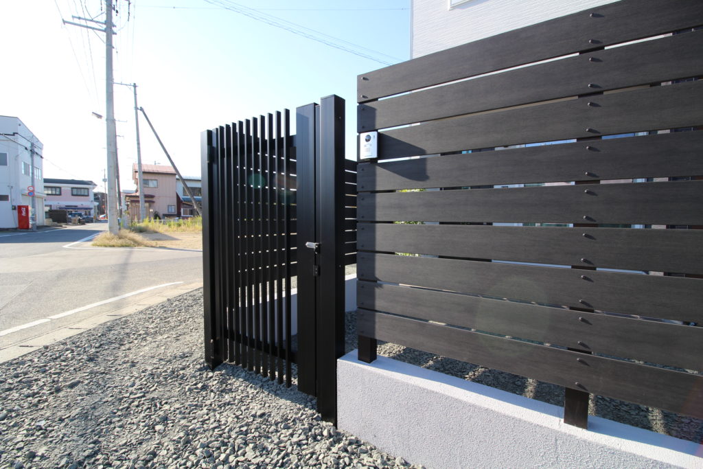 エクステリア 通りからの目線をカットするハイフェンスと門扉を設置しました。フェンスは一見木製に見えますがこちらは樹脂で出来た人工木で、柱はアルミ製です。木目の風合いが落ち着いた雰囲気で家の外観にもマッチしています。こちらのフェンスはメンテナンスがほぼいらず、色あせも少ないです。また高さのあるフェンスの為、基礎もブロックではなく住宅や倉庫の基礎に採用する布基礎で施工しました。