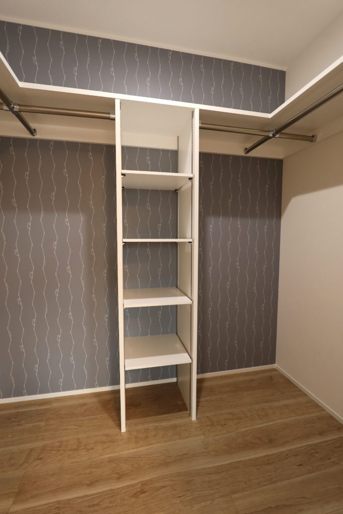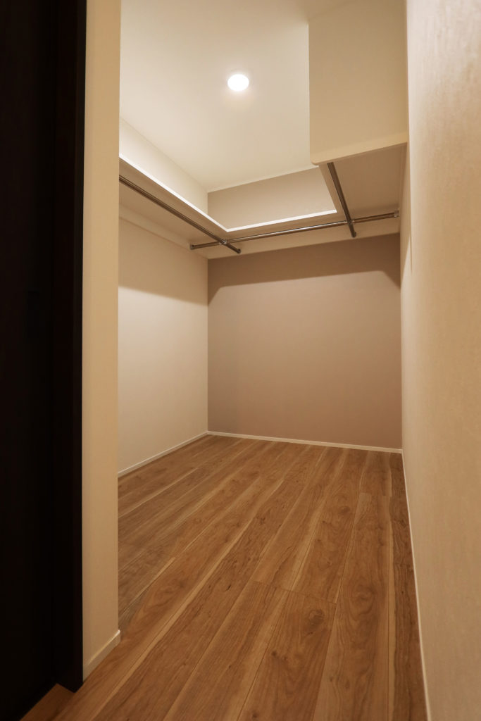 収納量たっぷりのWICです。ファミリークロークと連携して使用する事でさらに有効に使えます。こちらもドアをつけず、ウォークスルーでアクセスできる様になっています。奥のアクセントクロスは普段は目立ちませんが、WIC内の照明をつけるとお部屋のアクセントが見えるようになっています。