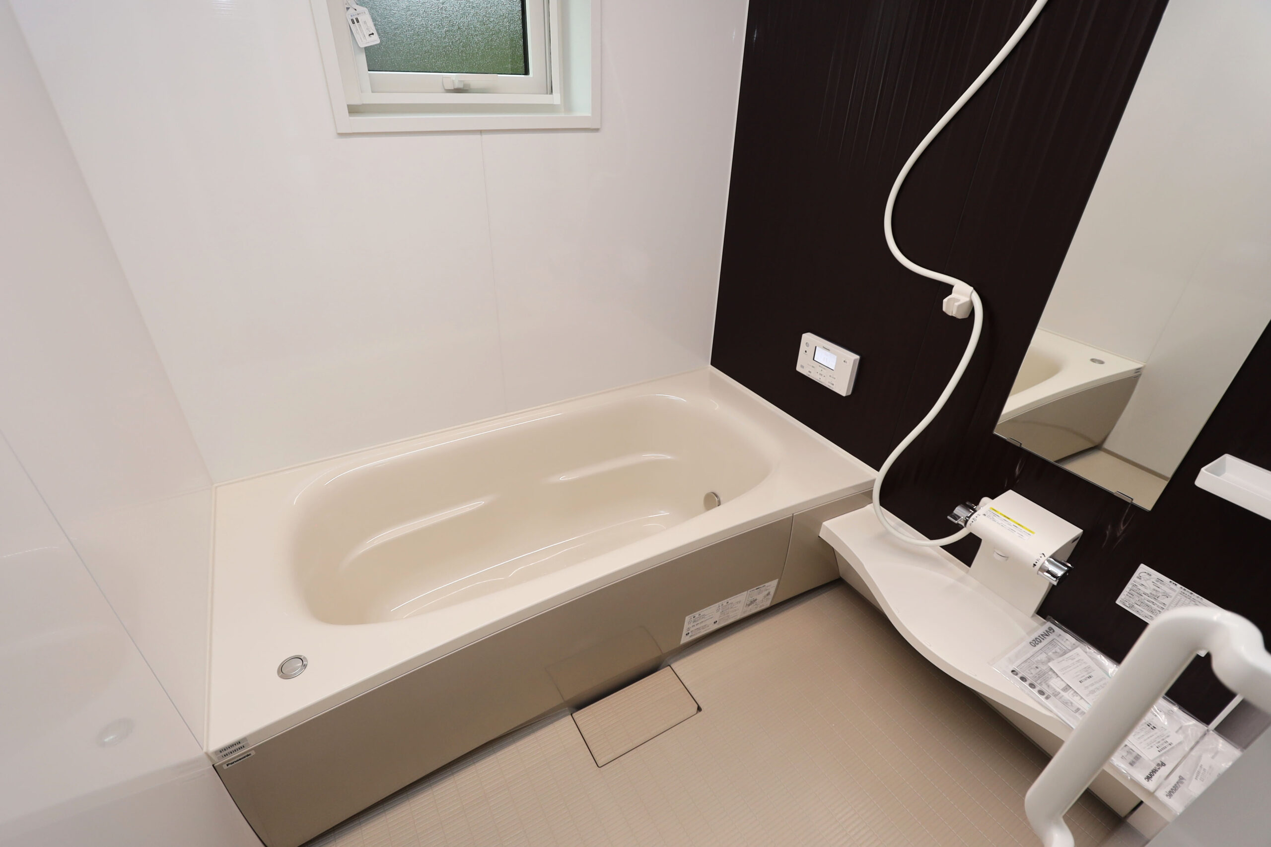 Panasonicのユニットバスです。上品な色合いのアクセントパネルが落ち着いた雰囲気で、一日の終わりにはリラックスして入浴できそうな空間です。