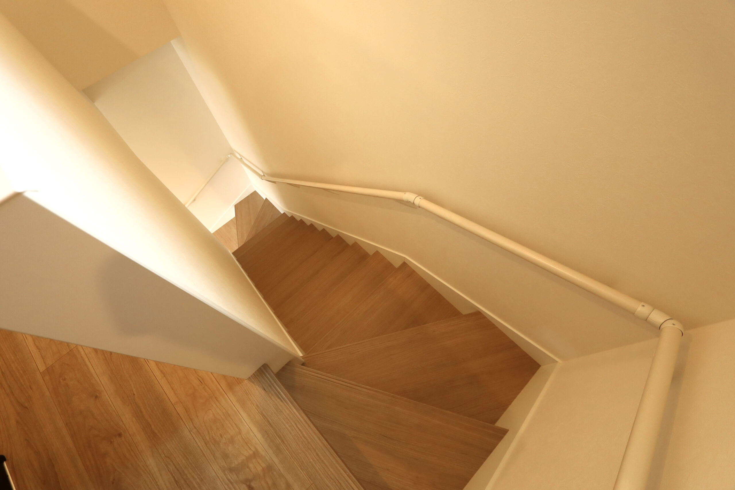 階段・2Fホール:階段は通常の設計より一段一段の高さを低めに設定したので上り下りが非常に楽です。小さいお子様の安全や将来の事も考えた設計になっています。