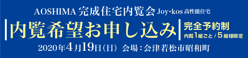 AOSHIMAの高性能住宅内覧を開催いたします。現在、コロナウィルスの猛威による安全性を考慮し、1時間毎に1組様限定で内覧会を開催いたします。午前10時から午後3時までの開催とさせていただきまして、5組様限定とさせていただきます。内覧希望の方は下記の青い内覧希望者募集バナーをクリックの上、必要事項をご入力の上、ご応募ください。希望時間は先着順とさせていただきますので、お早めにご応募ください。