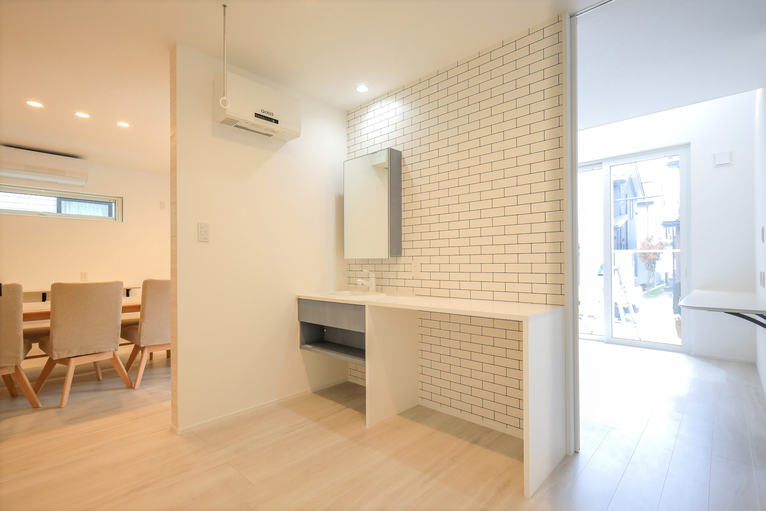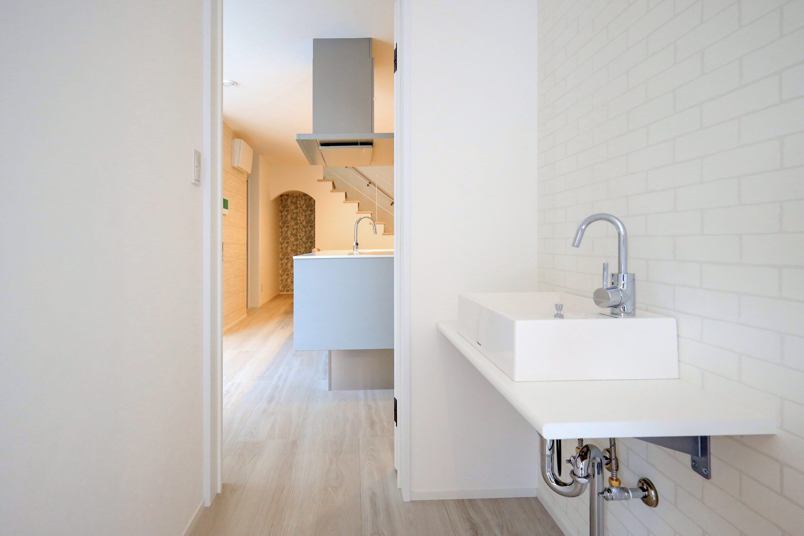 もう一つの入口には手洗いスペースを設け、リビングに入る前に手洗いやうがいができるようにしました。これにより、家の中を清潔に保つことができます。天板は水ハネしてもお手入れがしやすい素材を使用しています。また、来客時にお客様が利用できます。