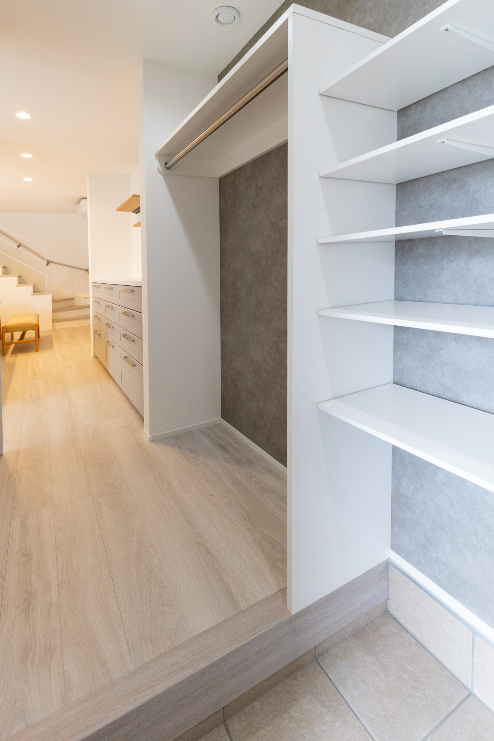 白を基調にした2WAY玄関。1つは、家族専用の入口からリビングまでの動線上にシューズクロークを備え、さらにコートなどをかけるスペースを設けました。小さなお子様を抱えて外出するときにも、クローゼットまで行かずに出入りできるので生活動線が大変便利です。また、脱ぎっぱなしや、リビングでの脱ぎっぱなしも防ぐことができます。