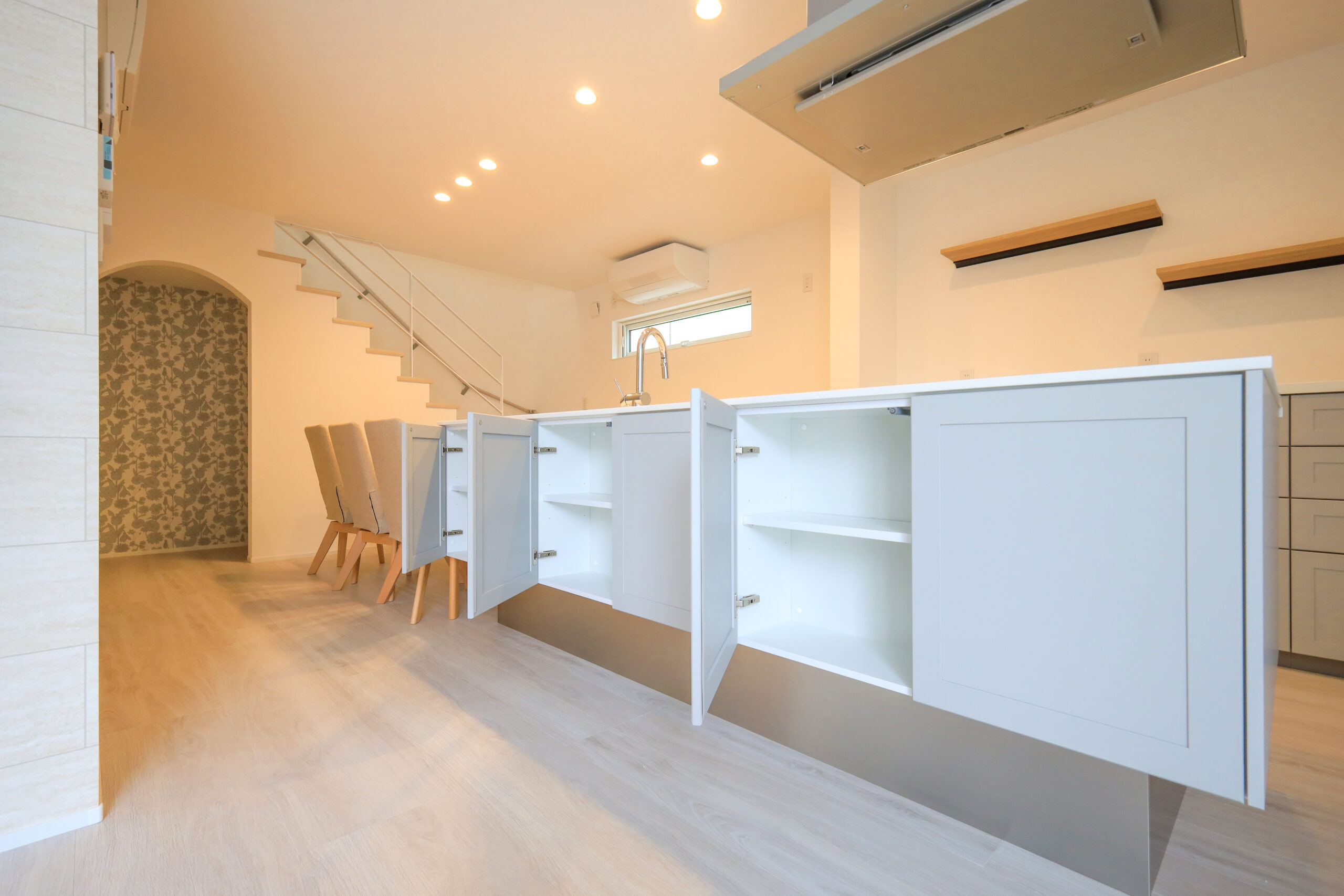 リビング側に面したキッチンの裏側は、大容量の収納ボックスになっています。散らかりがちな日常品などを整理して収納できるのがとっても便利です。収納スペースが多いことで、季節ごとに使用するアイテムや非常時のストック品などもまとめて収納でき、生活全体の快適さが向上します。