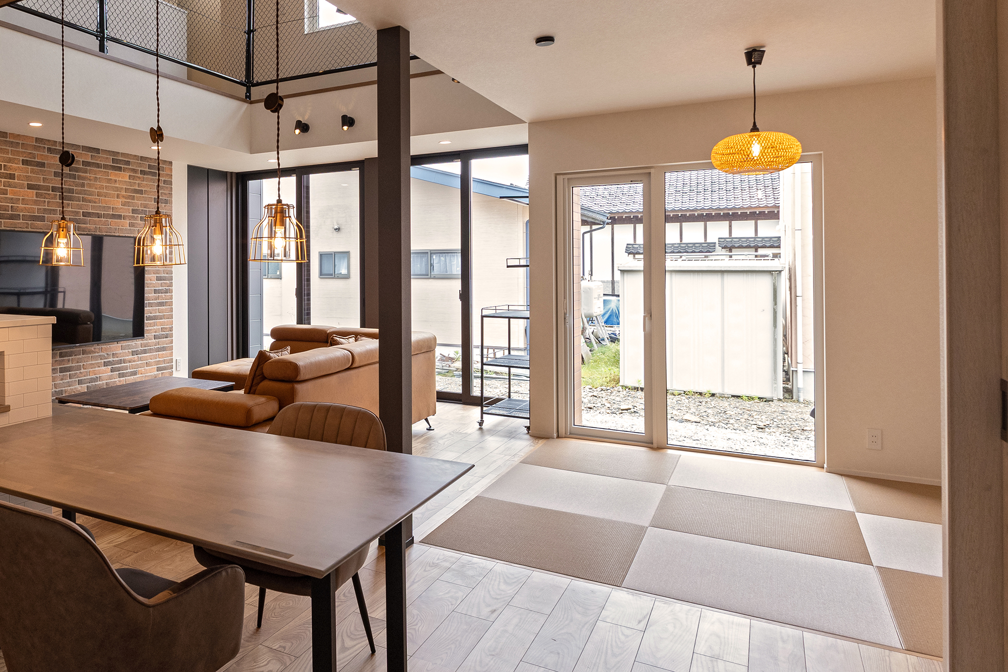 リビング・ウッドデッキと段差なくつながるフラットな和室は、空間全体に一体感を出し、掃除のしやすさにも配慮した設計です。畳には落ち着いたアースカラーを採用し、ヴィンテージ風のリビングとも調和。視線が抜けることで、開放的なつながりを感じられる和室空間です。