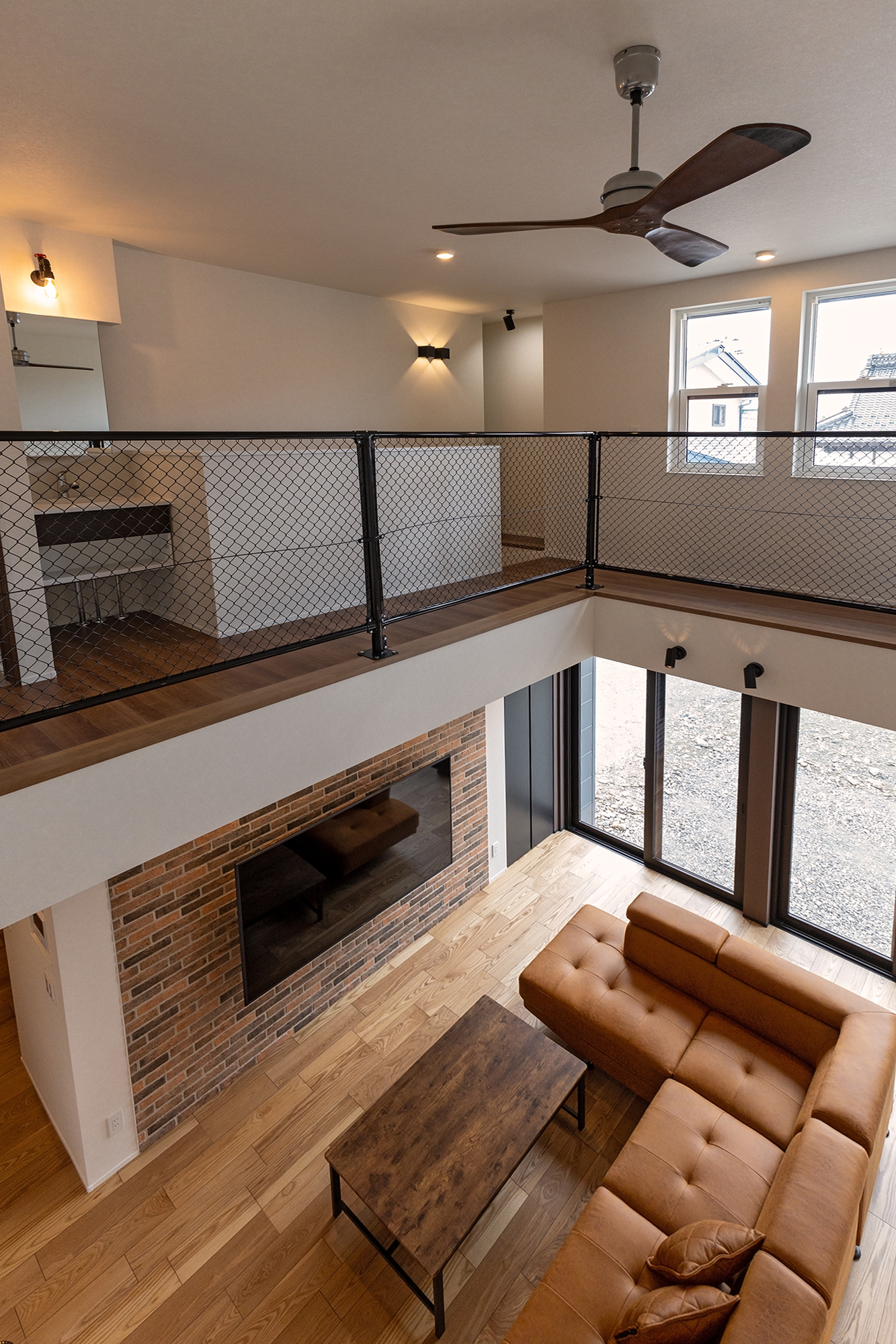 施主様のご希望で設けた、約7畳分の広々とした吹き抜けが、リビングにたっぷりと自然光を取り込み、明るく開放的な空間に。シーリングファンがやさしく空気を循環させ、快適な室内環境を保ちます。壁掛けテレビの背面には、ヴィンテージ調のレンガ壁を採用し、空間に上質なアクセントと落ち着きを加えました。