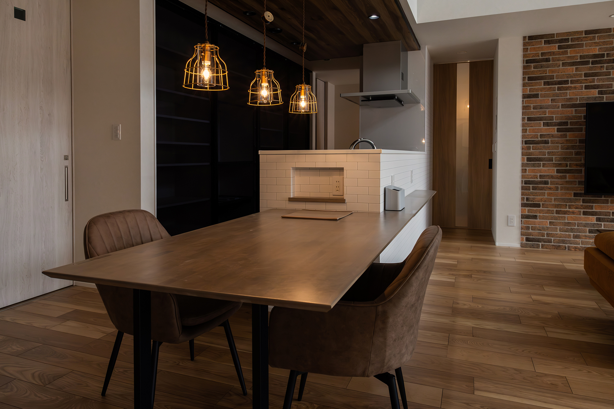 対面キッチンには高めの腰壁を設け、キッチン上にものがあってもリビングからは見えにくい工夫を施しています。天井には木目調の下り天井にダークカラーを組み合わせ、無機質で落ち着きのある雰囲気に。