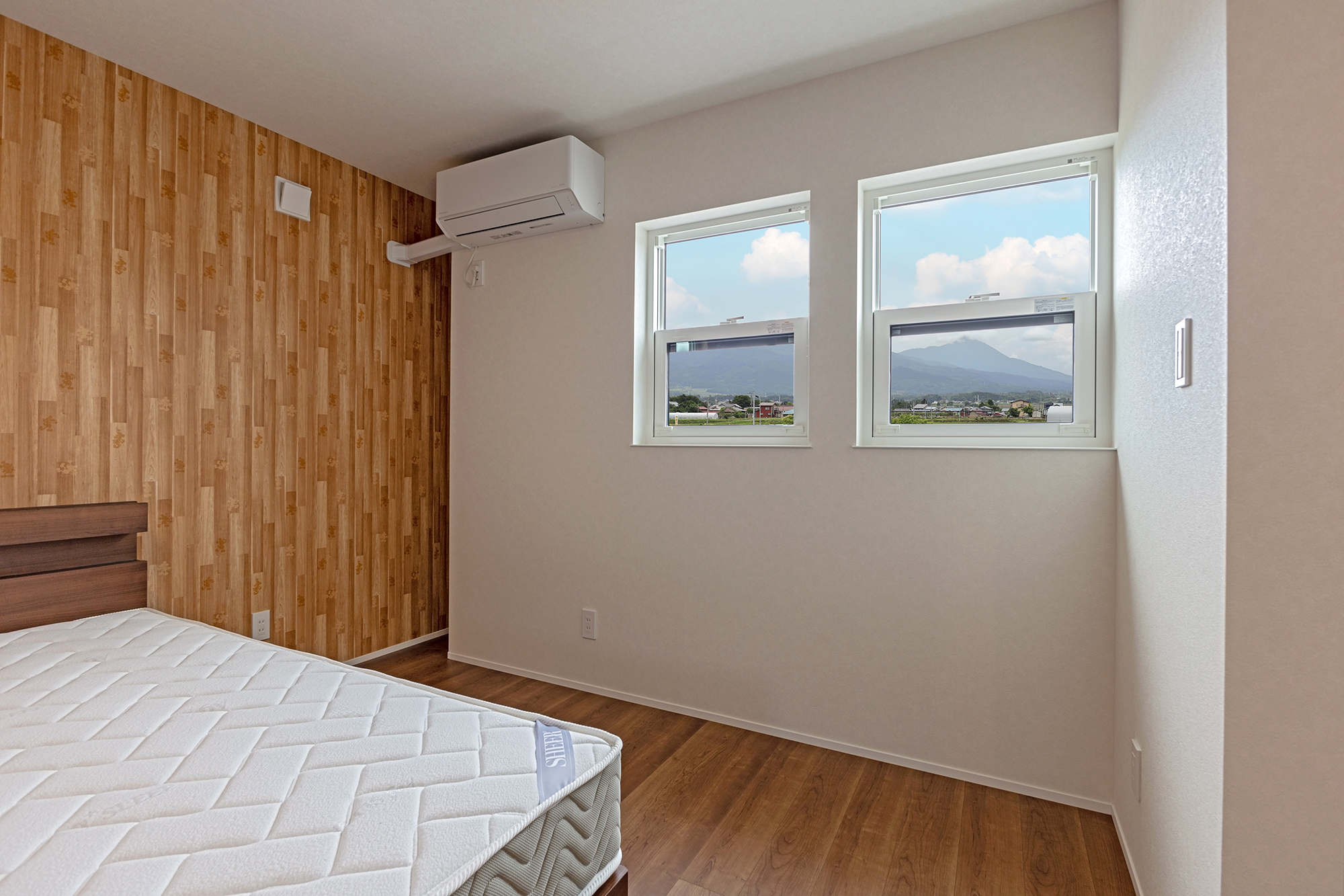 約8.8畳の広々とした寝室には、磐梯山を眺められる窓を配置し、朝の目覚めから心地よい眺望を楽しめる設計に。明るさと開放感を取り入れながら、木目調のアクセントクロスで落ち着きある寝室に仕上げました。